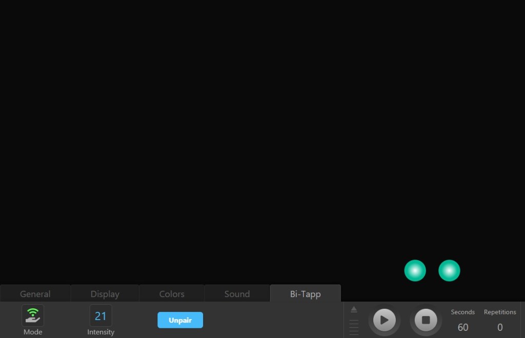 After setting up the integration, you can use the tappers as part of the BLS set. They will be fully synchronized with the visual and auditory stimuli. Turn the tappers on or off by clicking the Mode button, and control the taps’ intensity by setting their value between 1 and 40.