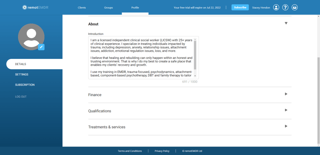 Qualifications: Tell clients where you got your degree from, your supervisor’s name, and the date you started practicing as a therapist. You can also enter your therapy license information, including the licensing country and ID number.