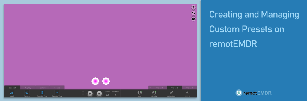 remotEMDR’s presets option enables you to choose a customizedset of session screen settings for each one of your clients. This way, you don’t have to choose your preferred settings again on each new session: you just save them under a preset, and they’ll be ready to use on all of the client’s future sessions.
